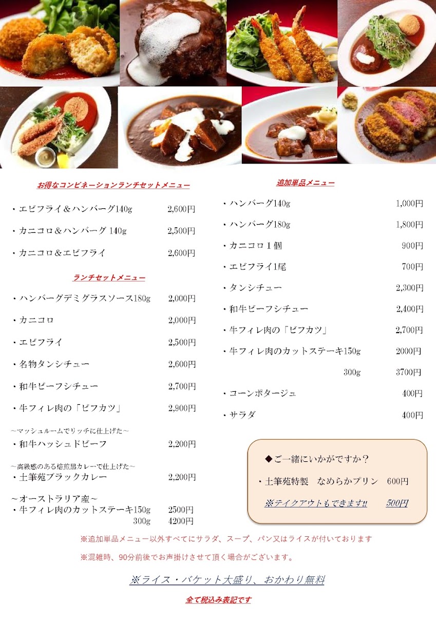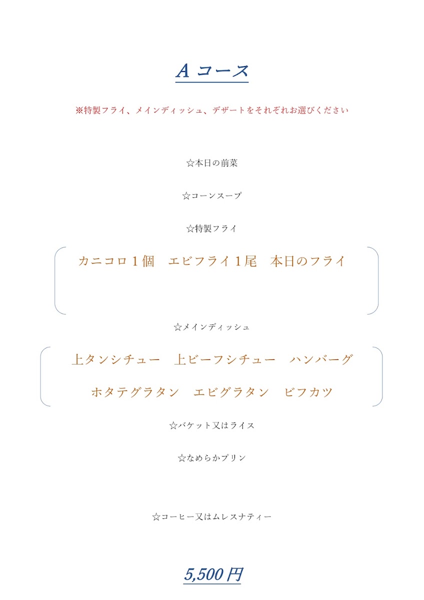 ☆本日の前菜 ☆コーンスープ ☆特製フライ以下から一品 (カニコロ 1 個 、エビフライ1尾、 本日のフライ) ☆メインディッシュ 以下から一品 (上タンシチュー、上ビーフシチュー 、ハンバーグ、ホタテグラタン、エビグラタン、ビフカツ) ☆バケット又はライス ☆なめらかプリン ☆コーヒー又はムレスナティー