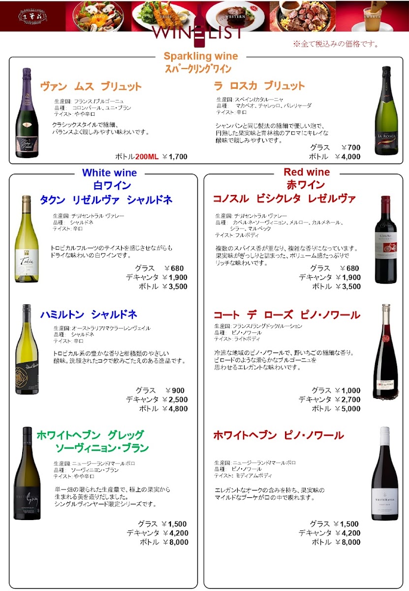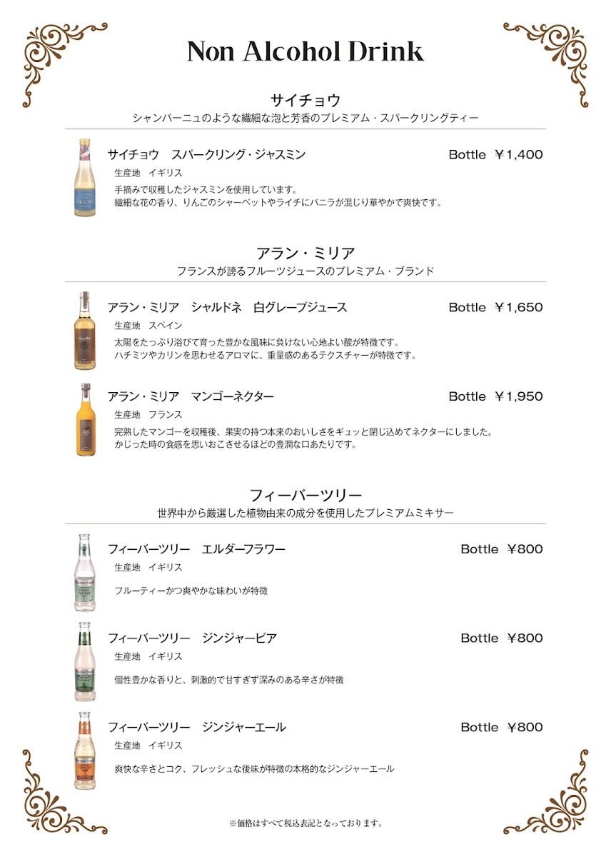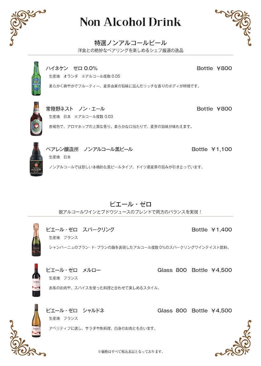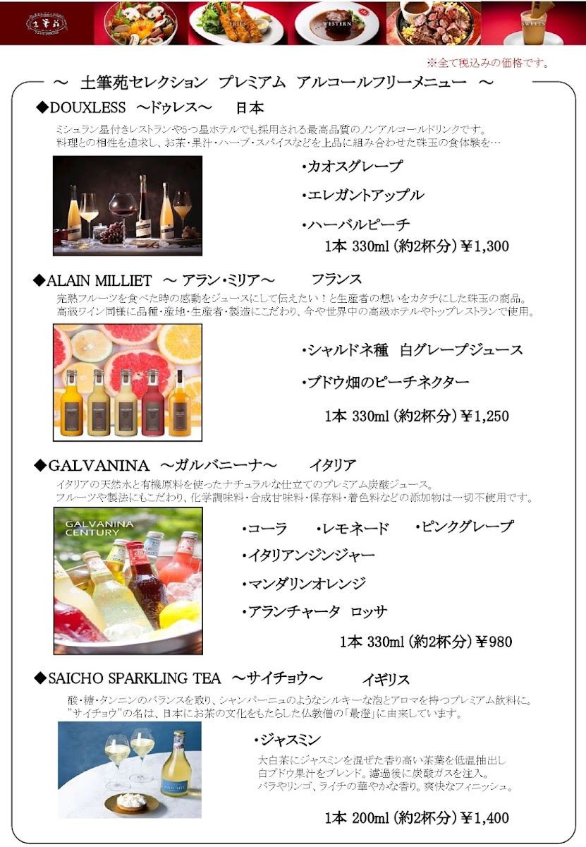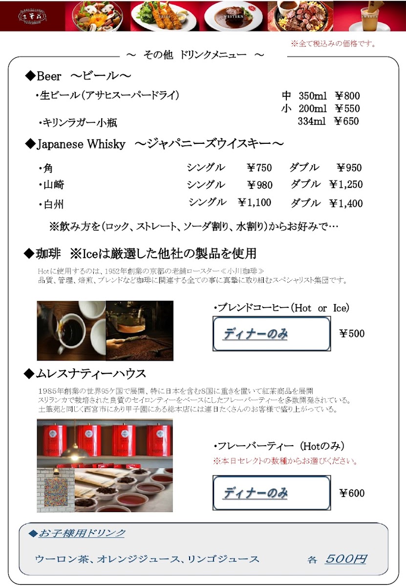 For those craving something crisp and indulgent, エビフライ (Fried Shrimp) delivers a timeless fried favorite, while steak lovers can opt for the bold flavors of 牛フィレ肉のペッパーステーキ (Beef Fillet Pepper Steak). The menu rounds off nicely with desserts such as IT’COOL Soft Cream Premium Vanilla and 洋食屋のチーズケーキ (Western-Style Cheesecake), offering a sweet, satisfying finish. Beverage options remain classic and reliable, featuring 生ビール(アサヒスーパードライ) (Draft Beer - Asahi Super Dry) and 角 (Kaku Japanese Whisky). Altogether, Tsukushi-En Nishinomiya’s menu feels cohesive and complete-ideal for diners seeking a refined yet approachable Western-Japanese dining experience.