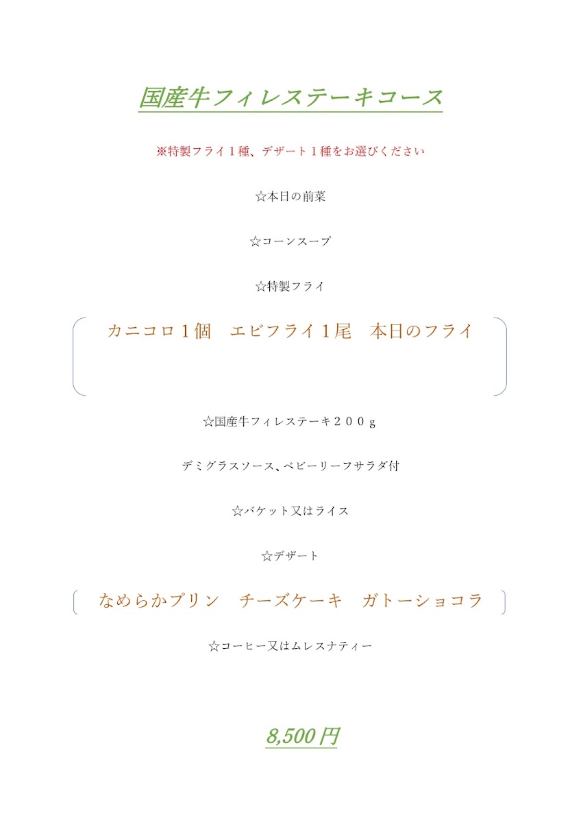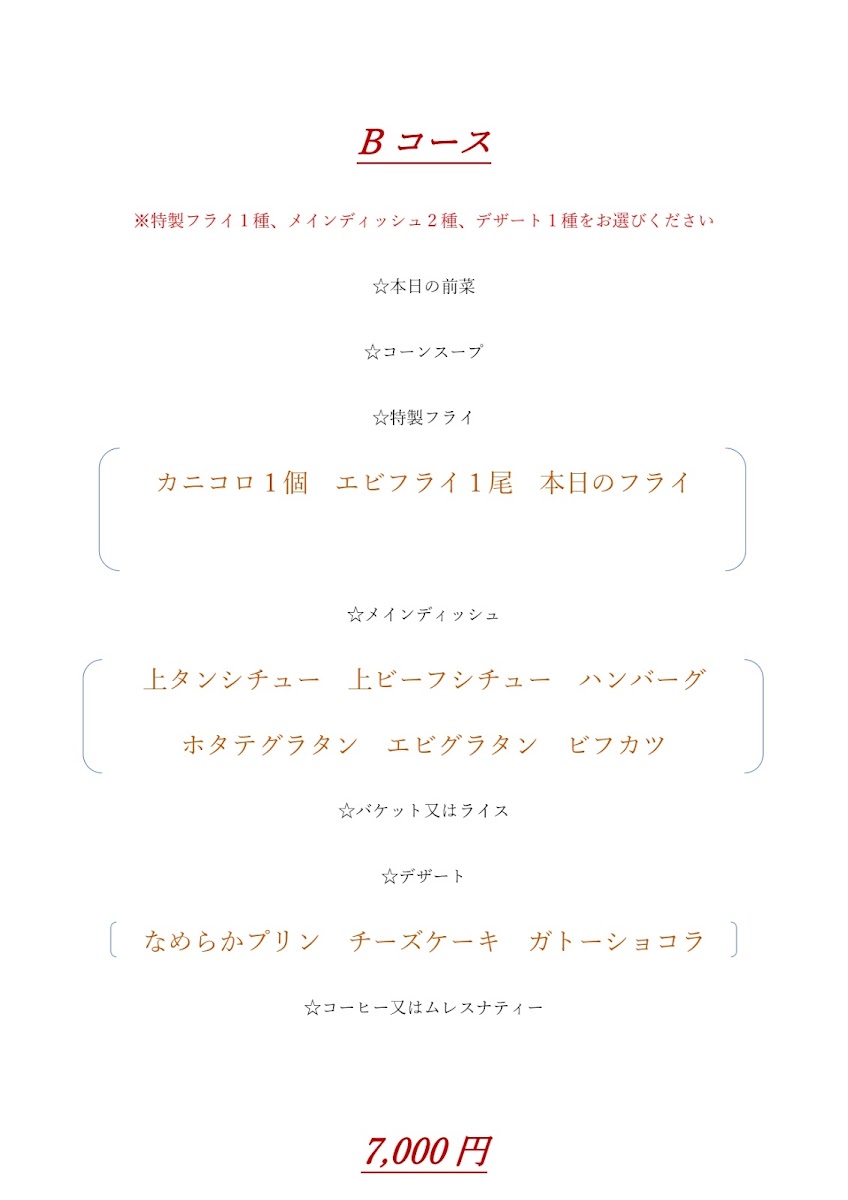 ※特製フライ1種、メインディッシュ2種、デザート1種をお選びください ☆本日の前菜 ☆コーンスープ ☆特製フライ (カニコロ1個 エビフライ1尾 本日のフライ) ☆メインディッシュ (上タンシチュー 上ビーフシチュー ハンバーグ ホタテグラタン エビグラタン ビフカツ) ☆バケット又はライス ☆デザート(なめらかプリン チーズケーキ ガトーショコラ) ☆コーヒー又はムレスナティー